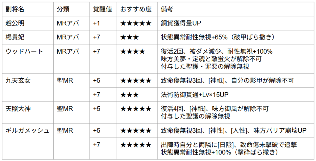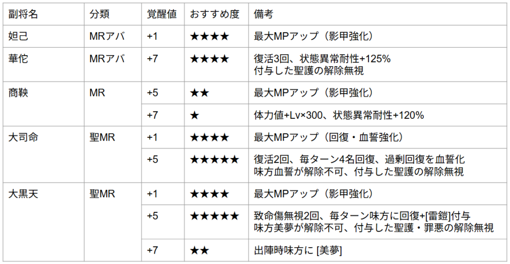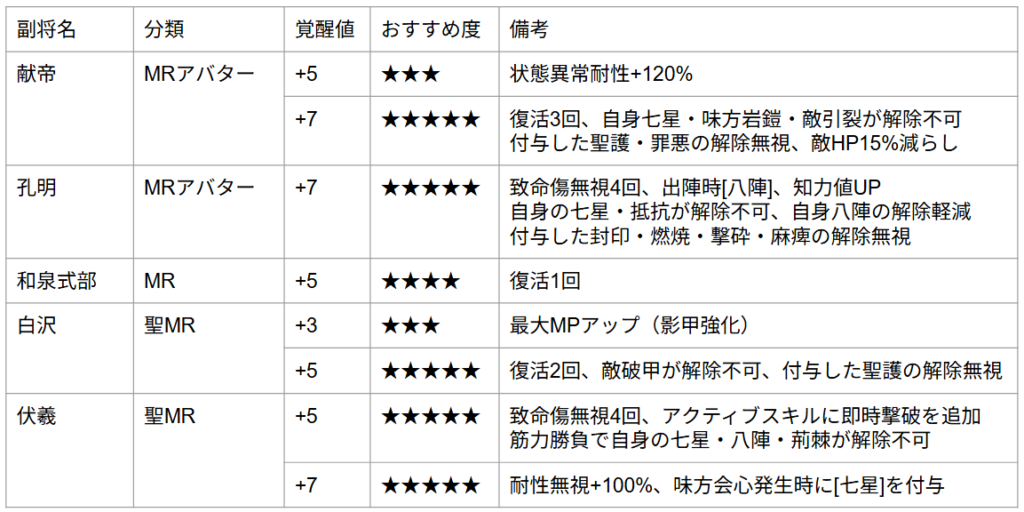 純MRと聖MRはどの副将も覚醒+5で復活や致命傷無視の効果を発動できるようになり