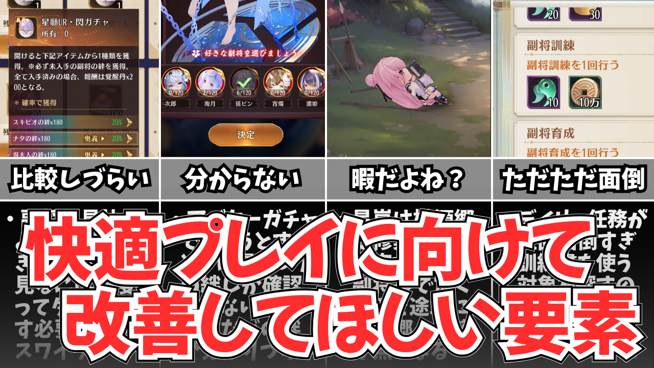 ストレスなく副将を選んでガチャを引くために、ぜひとも改善を検討していただきたい箇所として紹介させていただきます。