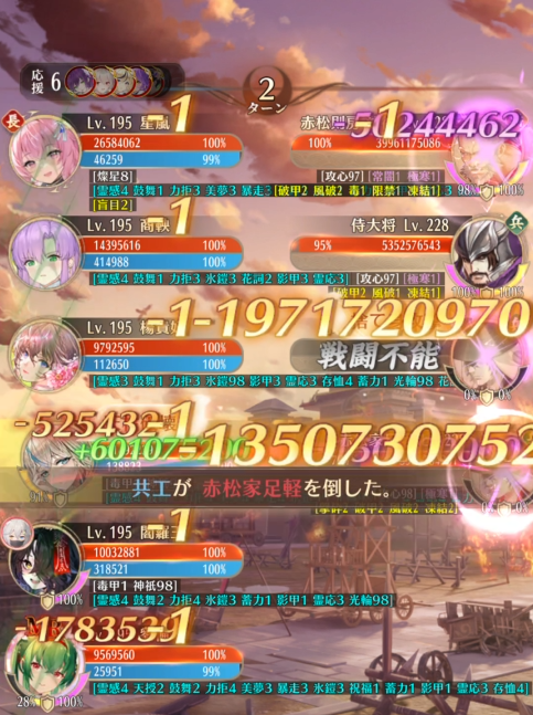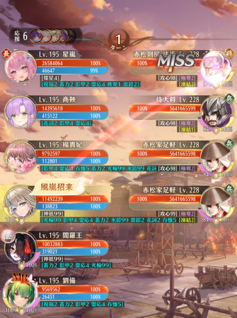 そして4ターン目には主将と甘氏が再度スキル1を発動できるようになるため、1ターン目と同じ状況になります。