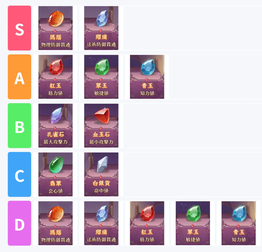 そのため物理防御貫通と法術防御貫通の宝石をSランクとしています。