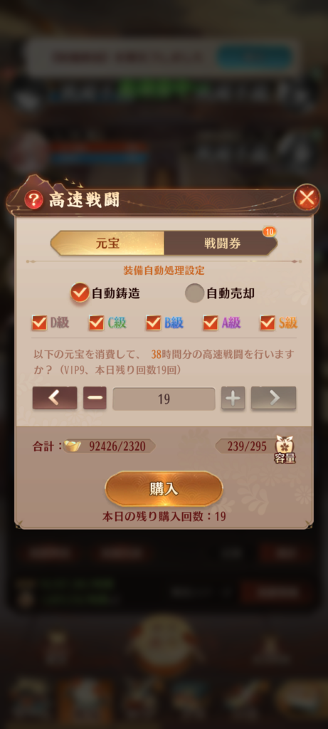 コスパの良いタイミングで高速戦闘に元宝を使うことで、消費元宝を抑えることが可能です。