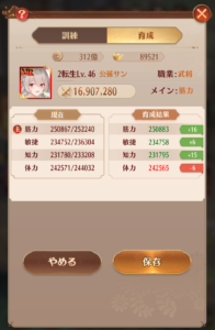 キャラに対して育成丹を使うと、4つの基礎ステータスごとにランダムで増減が発生します。