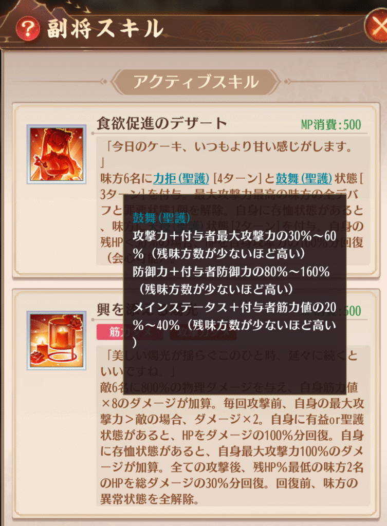 鼓舞の効果量は、スキル1で倒した敵の攻撃力と防御力と同じ値になります。