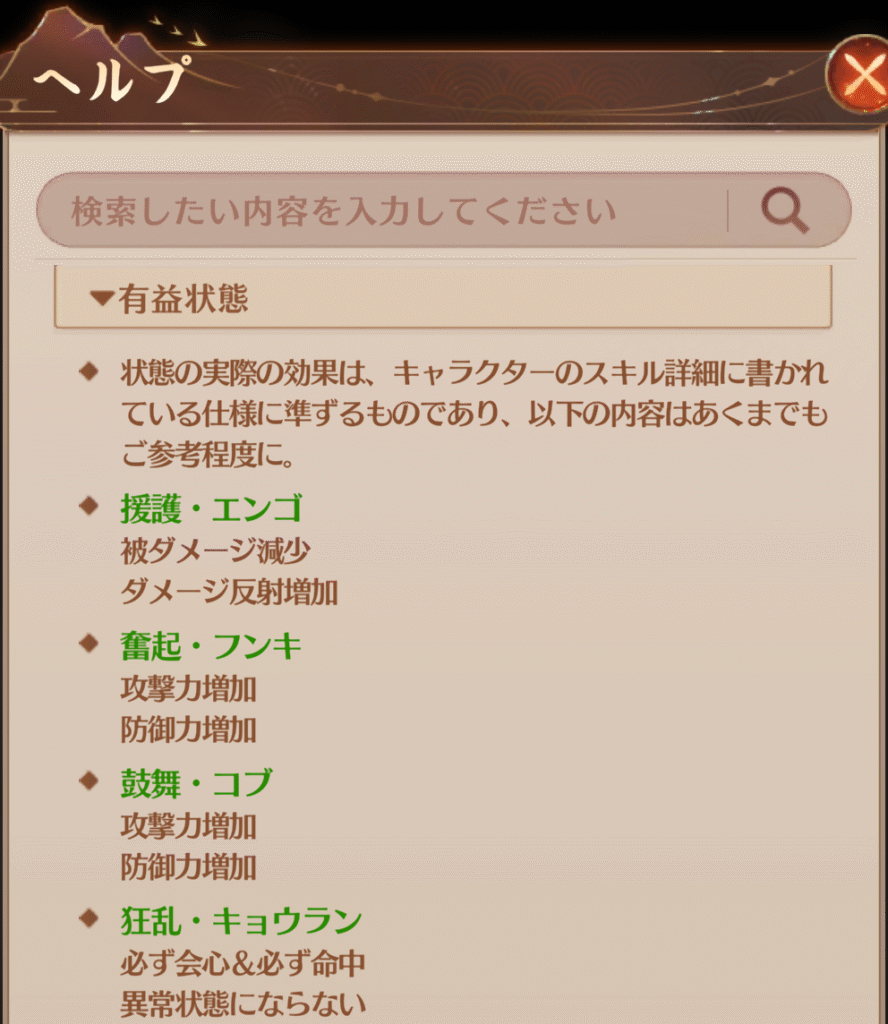 ヘルプ画面のバフの紹介順が「援護→奮起→鼓舞→その他」となっているため、